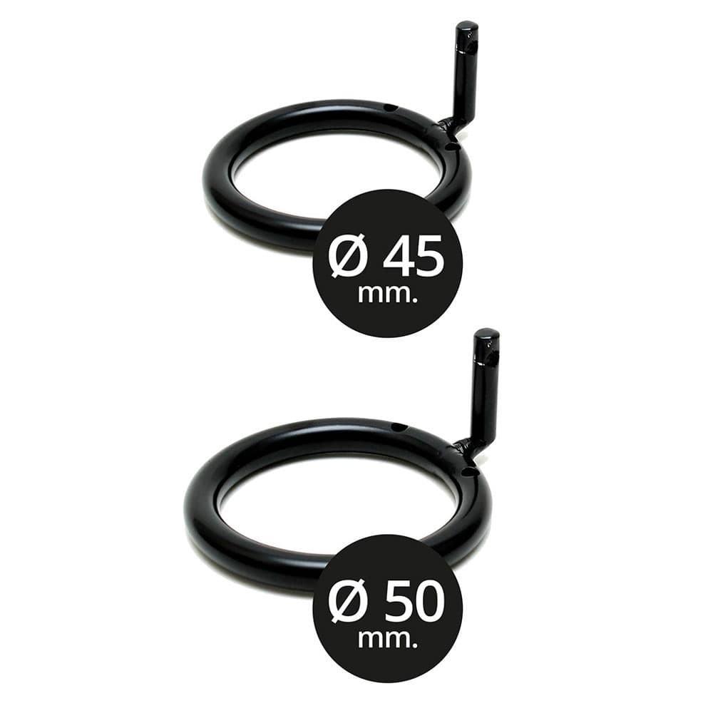 This chastity device is a two piece cock and ball restraint made out of metal. A cock ring that fits behind the balls and a wire cage that encloses and contains the cock. The cage is applied by placing the testicles through the ring so that it fits behind them. Then the cock is placed inside the wire cage. Two pins connect the cage to the ring. The larger pin has a hole to place the lock, which is included with the kit. The cage features holes for urination. Pulling on the cage section will tend to stretch the testicles. Contains, 1 padlock with 2 keys and two different sized rings, 45mm and 50mm.
