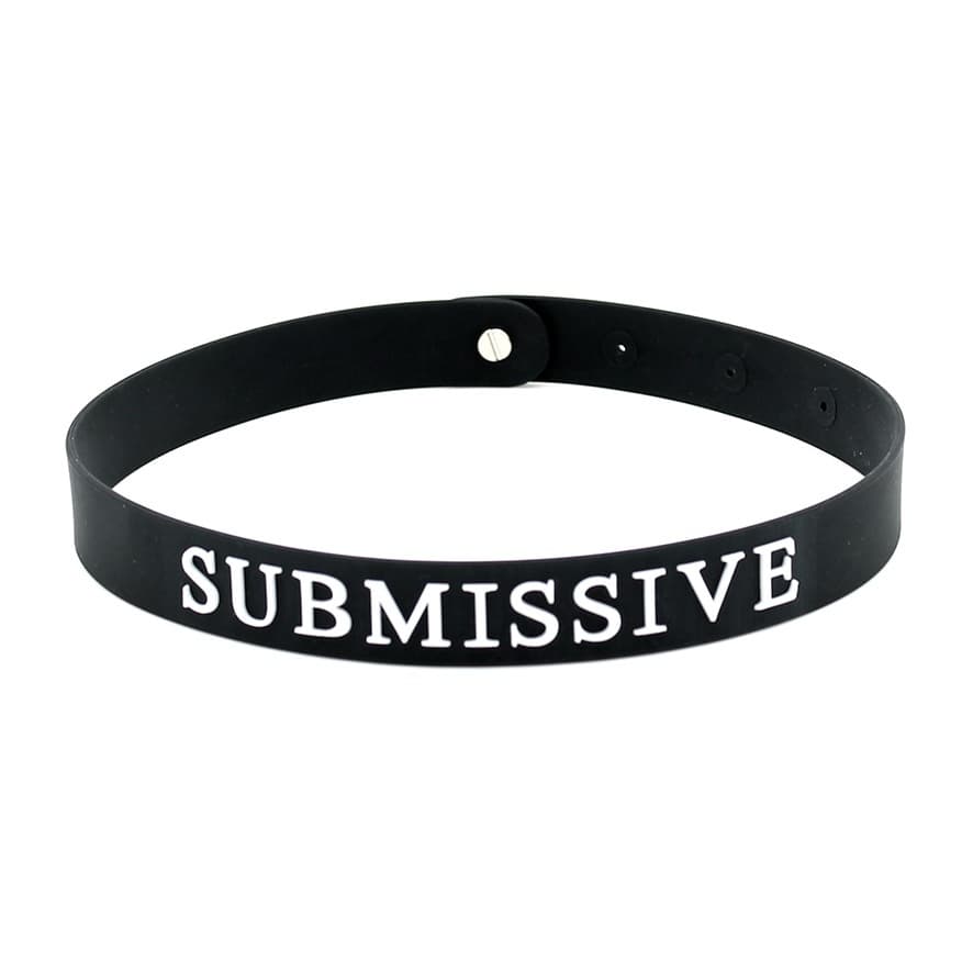 Black silicone adjustable collar. The word SUBMISSIVE is written on the front of the collar in white letters.