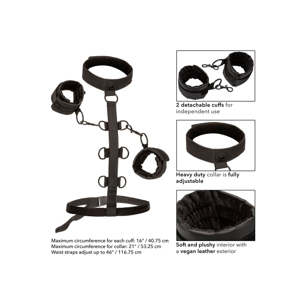Push the boundaries of pleasure and embrace endless bondage possibilities with the CalExotics Boundless Collar Body Restraint. Slip into this daring restraint system and explore passionate play in the vegan leather universal cuffs, heavy-duty collar, and multi-level restraint tether. fetishists and bashful beginners alike can indulge in passionate pleasure play by slipping into the wickedly sexy restraints and padded faux leather cuffs. Once youve wrapped this beautifully sinful collar around your neck, your dominant will delight in using the multi-levels of restraints to command and control your pleasure. The plush vegan leather cuffs are equipped with a heavy-duty universal clasp with a swivel design to give your pleasure a full range of motion. Plus, the detachable cuffs can be used independently for more adventures. Even the newest to submissive play will love the thrilling comfort of the plush inner layer of the collar and the cuffs double-padded, double-stitched design. Bring your most erotic dreams to life and dive deep into your most adventurous desires with this sensationally comfortable collar body restraint.