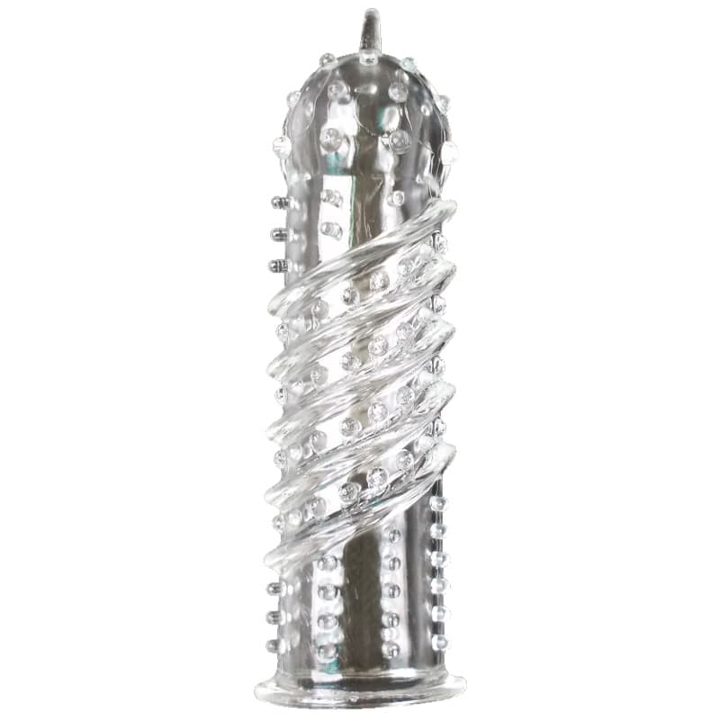 A cleared textured sleeve thats can be worn on the penis or placed on a vibrator to add extra texture and slight girth. Stretchy to accomodate most sizes.