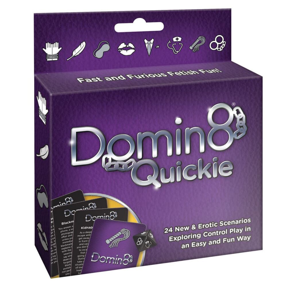 Domin8 Quickie contains, 24 brand new Domin8 scenarios Only the die holds the power to decide which fantasy you will be fulfilling. A simple roll will submerge you into the Domin8 Quickie Scenarios filled with Submissive and Dominant play. Erotic role play within the 8 different Domin8 categories awaits your discovery. Not only can Domin8 Quickie be your very own travel version of the original Domin8 game, but it can also be added to your Domin8 game for even more highly erotic scenarios for you to enjoy