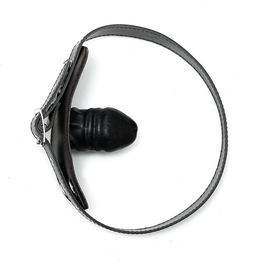 Genuine leather gag with internal latex dildo, adjustable with buckle.