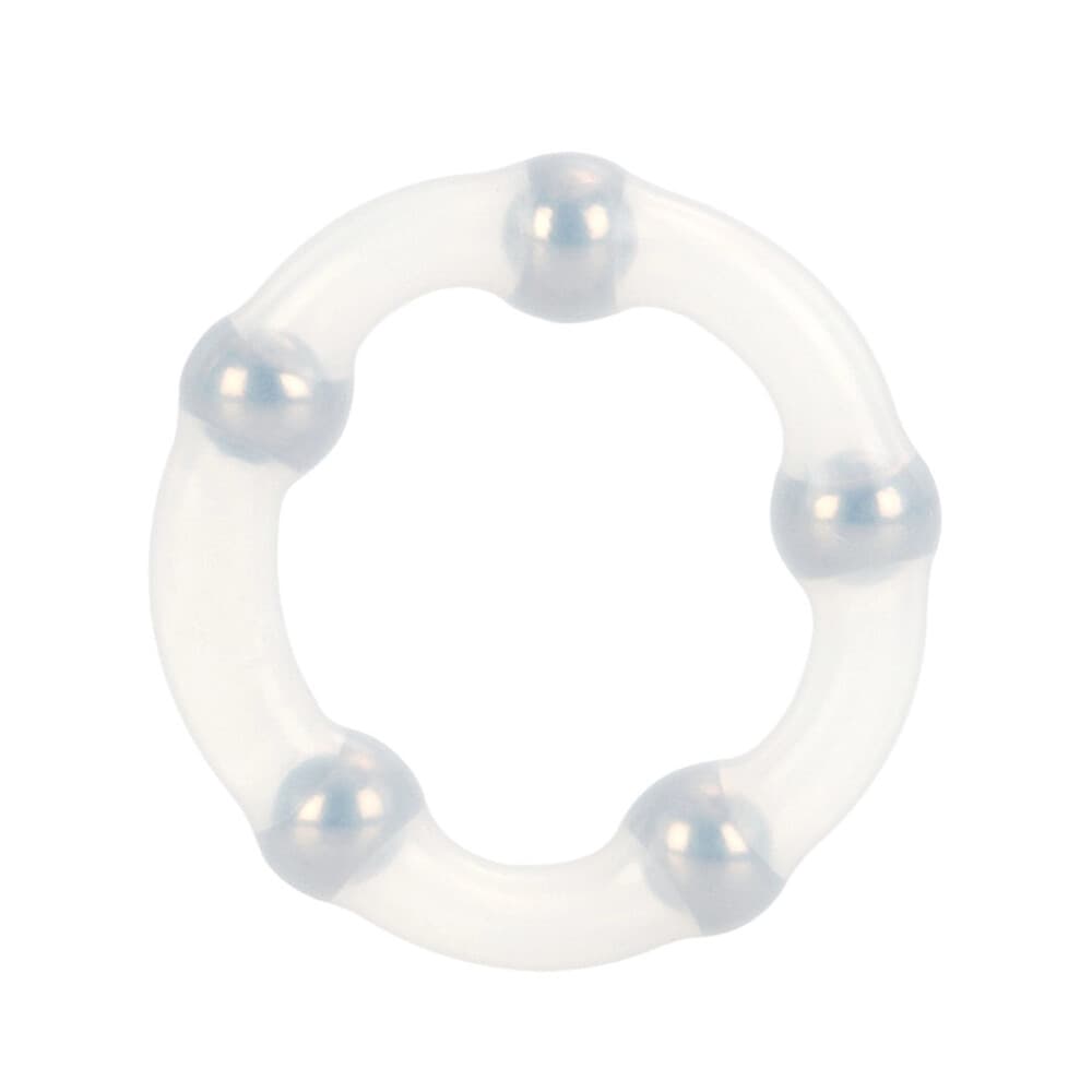 Stretchy enhancement ring with metal beads for stimulating tactile sensations. Realistic dildo not included