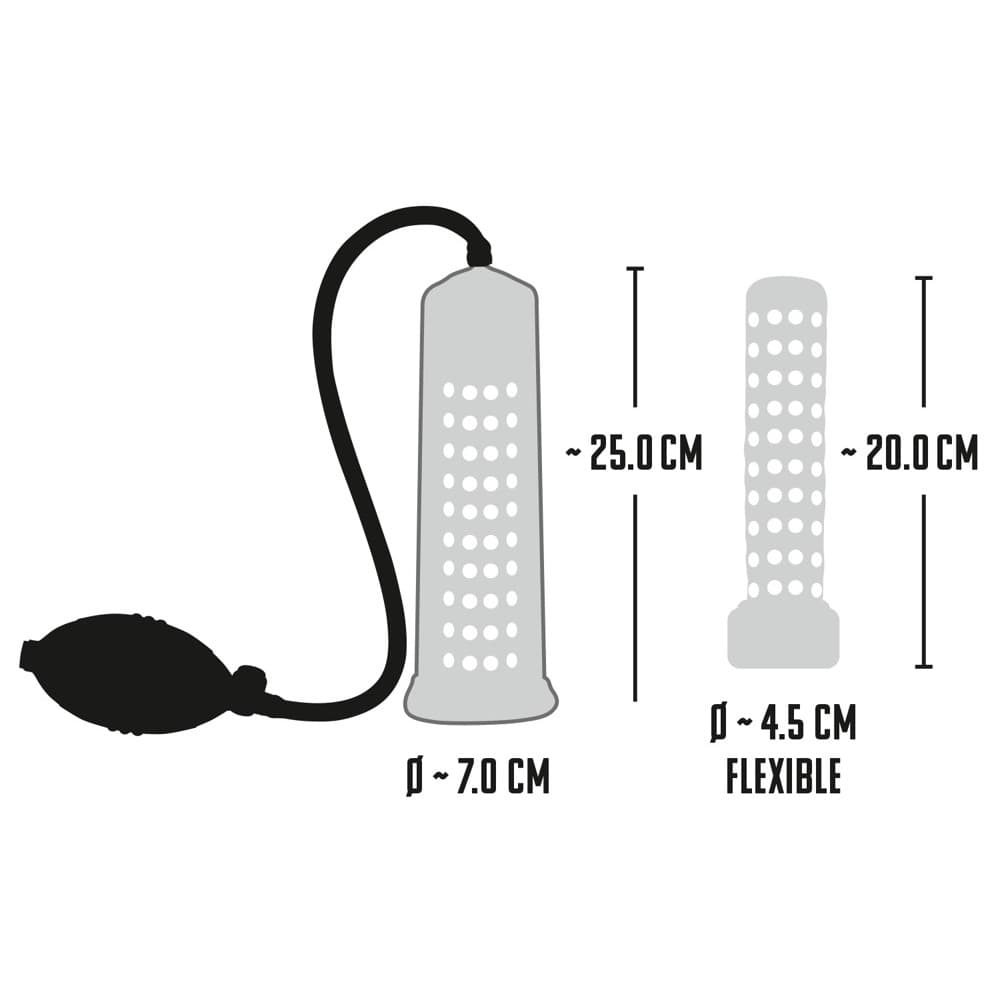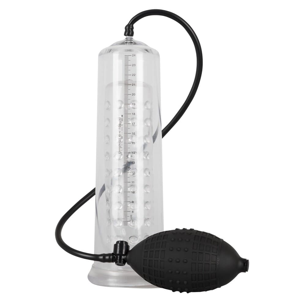 Enjoy awesome pleasure as you train your penis to top form with this transparent penis pump with studded inner sleeve and handy pump ball. You can see how much progress you have made enlarging your penis from the measuring scale on the side of the tube.