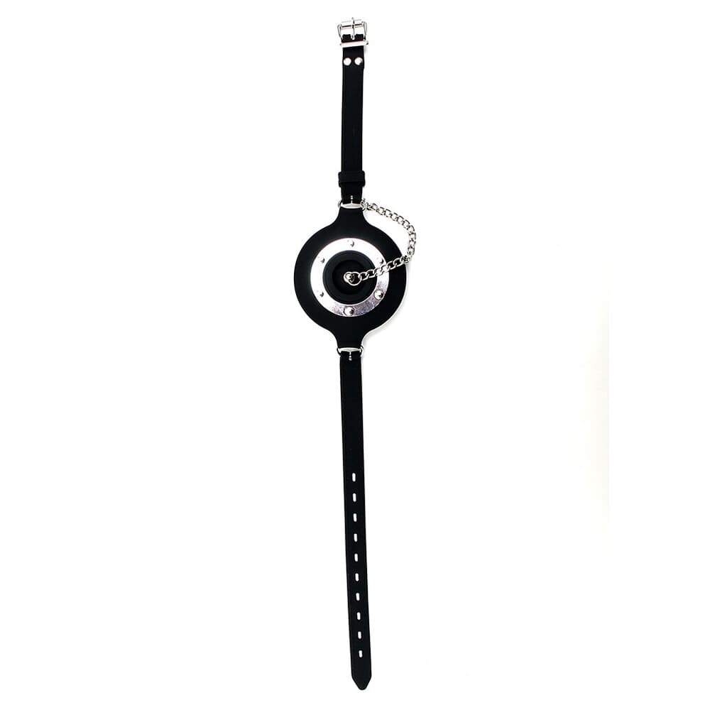 Latex Play black silicone mouth gag with removable sink stopper. Adjustable head strap with a buckle.