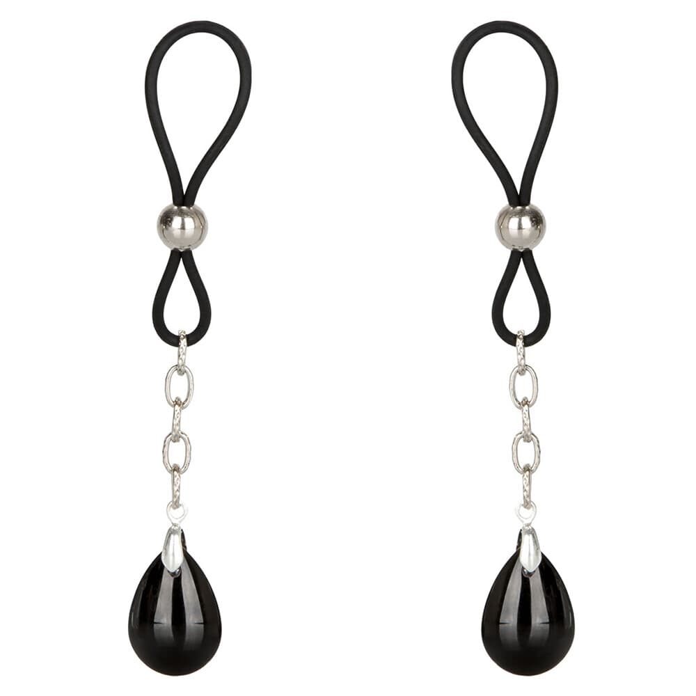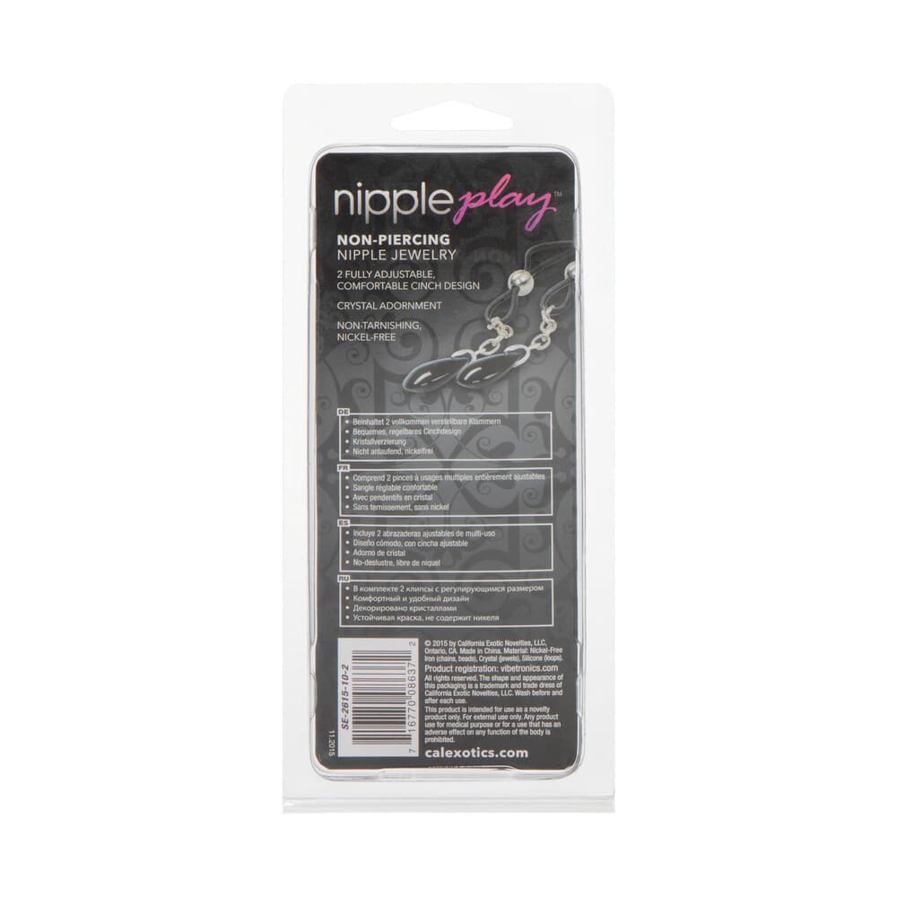 Push sensation to the next level and enjoy teasing nipple play with the Nipple Play Non-Piercing Nipple Jewelry Crystal Teardrops. Explore elevated sensation with the 2 fully adjustable nipple jewel adornments, pliable cinch and sparkling crystals. One glance at the sparkling crystal jewels will inspire frisky fantasies and make your lovers appetite water. Inspire feelings of sensuality, confidence and arousal when you tighten the slip cinch. The silicone cinch design allows playful beginners and fetishists alike to enjoy dazzling body jewellery. Tighten the adjustable cinch tension for intensified teasing and elevated pleasure. With the teasing cinch stimulation and increased blood circulation, you can look forward to amplifying nipple sensitivity and intensifying overall arousal. These easy-to-use nipple teasers are great for him or her. The two adjustable silicone cinch loops are made with adjustable nickel-free iron chains and Silica jewels.