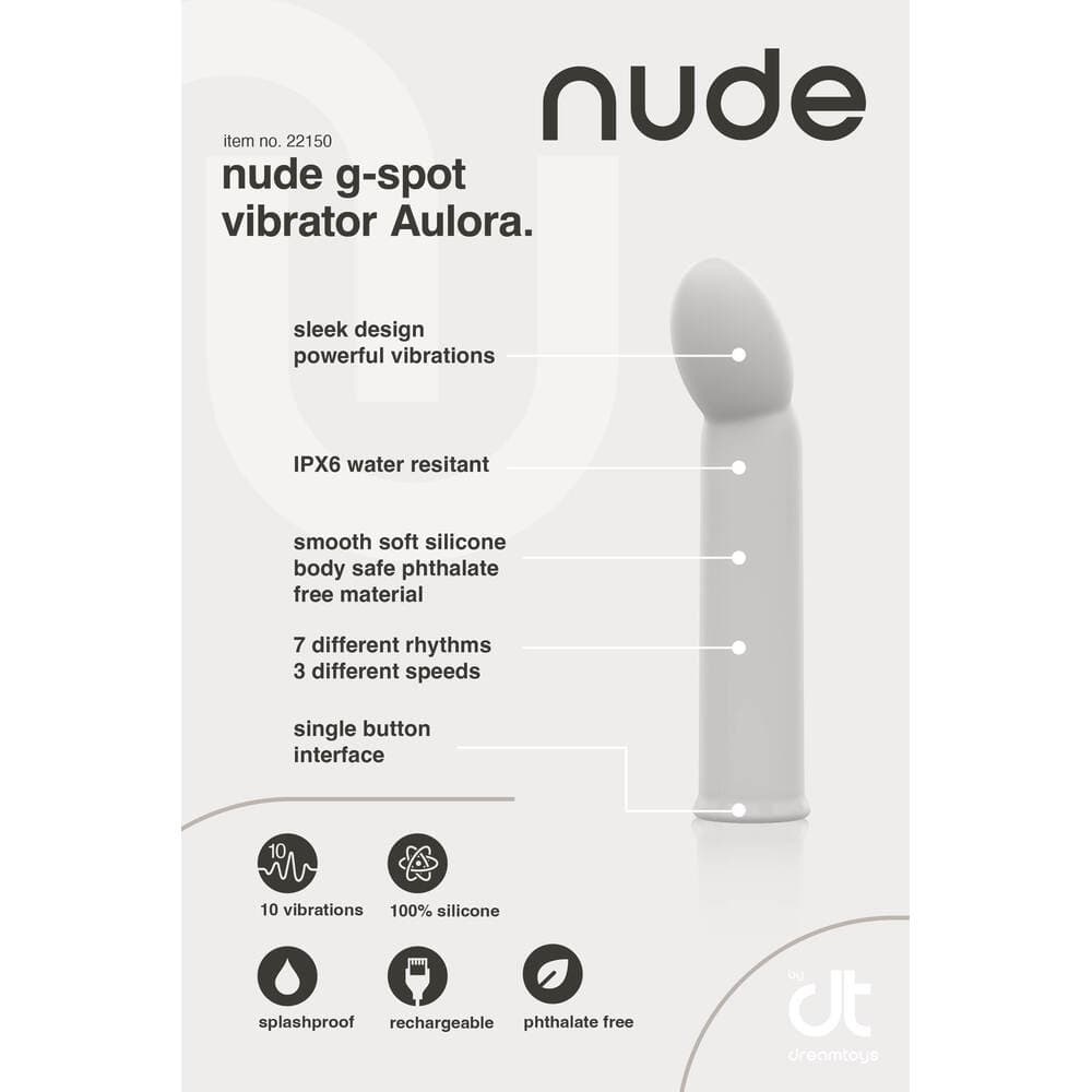 At Nude, we believe in the power of purity and quality. Thats why every one of our products is meticulously crafted to provide you with an experience thats as natural as possible. Say goodbye to anything less than extraordinary and unlock the true essence of pleasure with our clean and refined toys. Experience the pleasure revolution thats sweeping the world the Nude revolution. Our products are more than just toys theyre gateways to euphoria and liberation. Lets get naked and unleash your most audacious fantasies with Nudes premium range of sensual delights. Its time to redefine pleasure, the Nude way. For ease of use, this travel-sized G-spot Vibrator Aulora by Nude has a single-button operation to cycle through the 10 strong vibrations. It has 7 rhythms and 3 speeds. The shape and size make it perfect for beginners and for anyone who likes subtle and tantalizing G-spot stimulation. The Nude vibrator is made of smooth soft silicone and ABS, free of phthalates and body safe. Aulora has an IPX6 rating for water resistance. For charging after use the vibrator has a waterproof charging hole. A USB pin cable is included. After a full charge, your Nude vibe is ready for 90 minutes of nudelicous delight. Lets get naked and discover the world of Nudelicious ecstasy! Nude Aulora Travel G-spot vibrator 7 Vibration rhythms, 3 speeds Single button operation Made of silicone and ABS Body safe, free of phthalates IPX 6 water resistance Toy bag included Rechargeable, waterproof charging hole USB-pin cable included Length 14,1 cm Diameter 3 cm