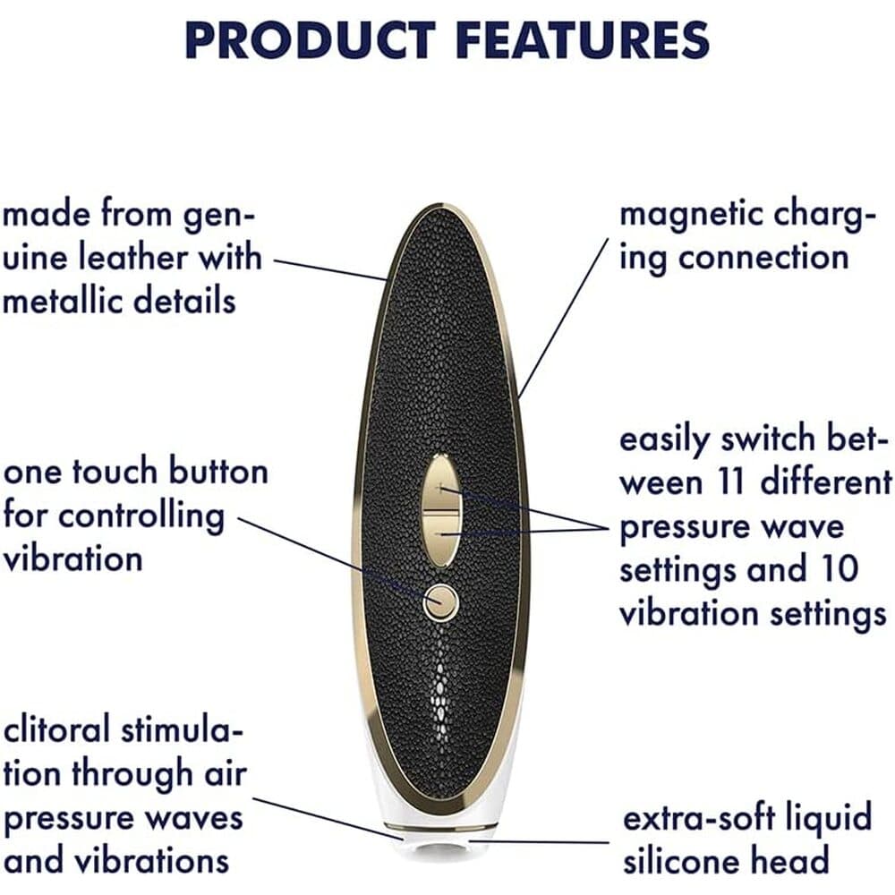 Do you love a touch of extravagance and dont want to do without luxury with your sexual wellness devices? The Satisfyer Haute Couture from our Luxury Collection not only looks high quality and elegant, but The pressure wave vibrator also pampers your clitoris with a sensual blend of pulsating pressure waves and intense vibrations. Its round application head made of smooth liquid silicone gently surrounds the clitoris stimulating you with a caressing touch. The ergonomic handle with fine details in real leather and metal also fits comfortably in your hand.
