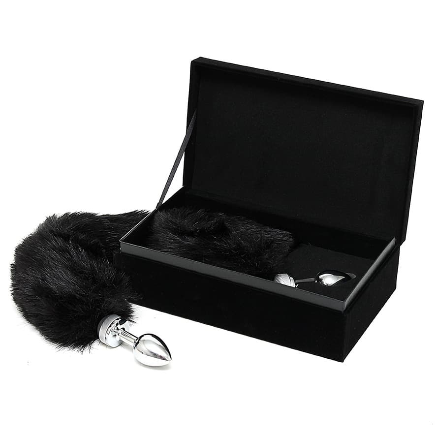Small smooth stainless steel anal plug with a long black bushy faux tail, all in a black presentation box. The butt plug is 3.5 inches long, 2.5 of which is insertable. The tail measures 12 inches in length.