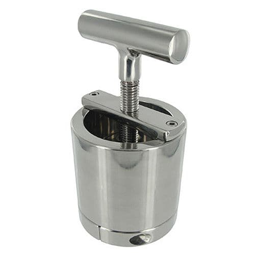 Make your sub beg with the heavy steel Ball Press Chamber. Secure the removable ring around their scrotum, then place their balls into the hollow chamber. Use the included hex key to lock the ring onto the end of the chamber and their boys are now enclosed in a cool steel cylinder. Now you are in control As you slowly turn the T handle, a steel disc inside the Press Chamber descends on their balls, gradually reducing the amount of space inside the cylinder. Warn them with a bit of gentle pressure, then maybe tighten things down some more for some more serious discipline. Get instant compliance to your slightest demand, every time, with the steel Ball Press Chamber